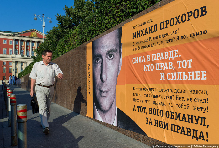 Вот такая пародия на рекламу Михаила Прохорова появилась сегодня в центре Москвы. Авторы приводят более полную цитату из фильма Брат-2. Напомню, что лидер партии "Правое дело" Михаил Прохоров в рамках своей личной рекламной кампании использовал слоган, который очень похож на знаменитую фразу Данилы Багрова из фильма "Брат-2". Плакаты в черно-желтых цветах, подписанные словами "Сила в правде. Кто прав, тот и сильнее", появились в начале августа по всей России.